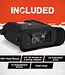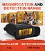 For dark environments, it features an integrated IR illuminator rated up to 2200 mW (high mode), with stated night viewing capability beyond 150 meters. It works day and night and runs on four AA batteries (included). The included DNV headmount enables hands-free use, and action camera mount compatibility makes it easy to attach to tripods or helmets.