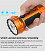 Dankzij het ingebouwde zijlicht zet je de lamp rechtop neer als werk- of kampeerlicht (handen vrij). De 7.500 mAh accu levert vooral op lage standen een zeer lange brandduur; in turbo dimt de lamp automatisch om warmte te beheersen.